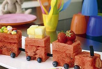 1. Cortar la sandía en forma de cubo y quitarle la cáscara. Trocear la pulpa en 3 porciones de 6x5 x4 cm aprox., que serán los vagones, 3 de 3x5x4 cm, que será la “carga” sobre los vagones, y 1 de 5x5x4 cm, que será la locomotora.