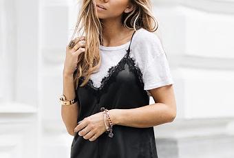 El mix más visto hasta ahora ha sido el vestido negro lencero con camiseta básica blanca,aunque no se descartan vestidos de flores o con otros colores, de esta forma es una manera mucho más cómoda de llevar escotes y las transparencias que éstos vestidos suelen tener.