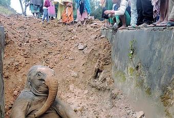 Afortunadamente , a pesar de que el elefante estaba asustado por la caída, no resultó herido.