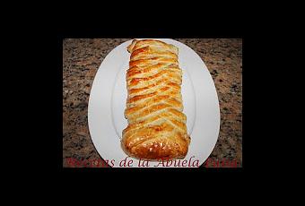 - En una sartén a fuego medio-alto sellamos los escalopines por ambos lados, reservamos mientras se enfrían. - Cortamos las lonchas de jamón y de queso. - Estiramos un poco la lámina de hojaldre con el rodillo. - Dividimos mentalmente el hojaldre en tres partes, en la central ponemos una fila de lomo un poco de pimienta y sal ( no mucha ya que el jamón aporta sal), jamón, queso, repetimos la secuencia y terminamos con lomo y un poquito de pimienta y sal. - Hacemos unos cortes inclinados a ambos lados del hojaldre, cerramos el hojaldre sobre el relleno en forma de trenza.