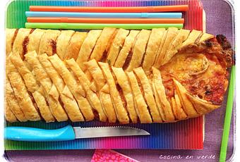 – 1 lámina de masa de hojaldre. Si la haces tu mism@ pues no va a ser tan rápida la cosa… :-) Es la primera vez que uso este tipo de masa hojaldrada prefabricada… y la verdad es que me ha gustado mucho. Pienso seguir experimentando… cualquier cosa casa y en su versión dulce o salada… genial!!!! Si alguien conoce receta para hacer la masa que me lo cuente por favor!!!! Me gustaría mucho probar.