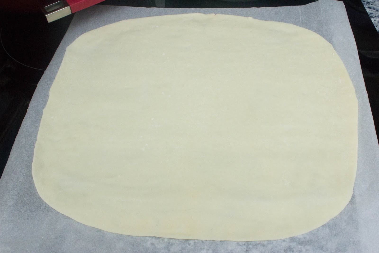 Extender la masa brisa hasta que quede casi cuadrado. No pasa nada si no queda del todo rectangular o cuadrado, solo que se parezca.