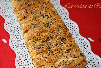 Preparamos la lámina de hojaldre como se muestra en la foto. Echamos en el centro el frito de pollo y verduras, ponemos el queso en trocitos por encima y vamos envolviendo con las tiras de manera que se vaya formando una trenza, la pintamos con huevo batido y espolvoreamos con semillas de sésamo.