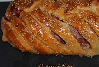 Para crear el efecto de trenza con la masa en primer lugar doblar los extremos hacia arriba y después ir trenzando las tiras sobre la carne de salchichas, (en la siguiente fotografía se muestra perfectamente).