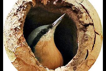 El trepador azul asomando desde su posible nido, un platanero .