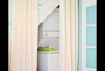 Si tienes algún rincón muerto en una habitación puedes colocar unas bonitas cortinas que oculten la lavadora
