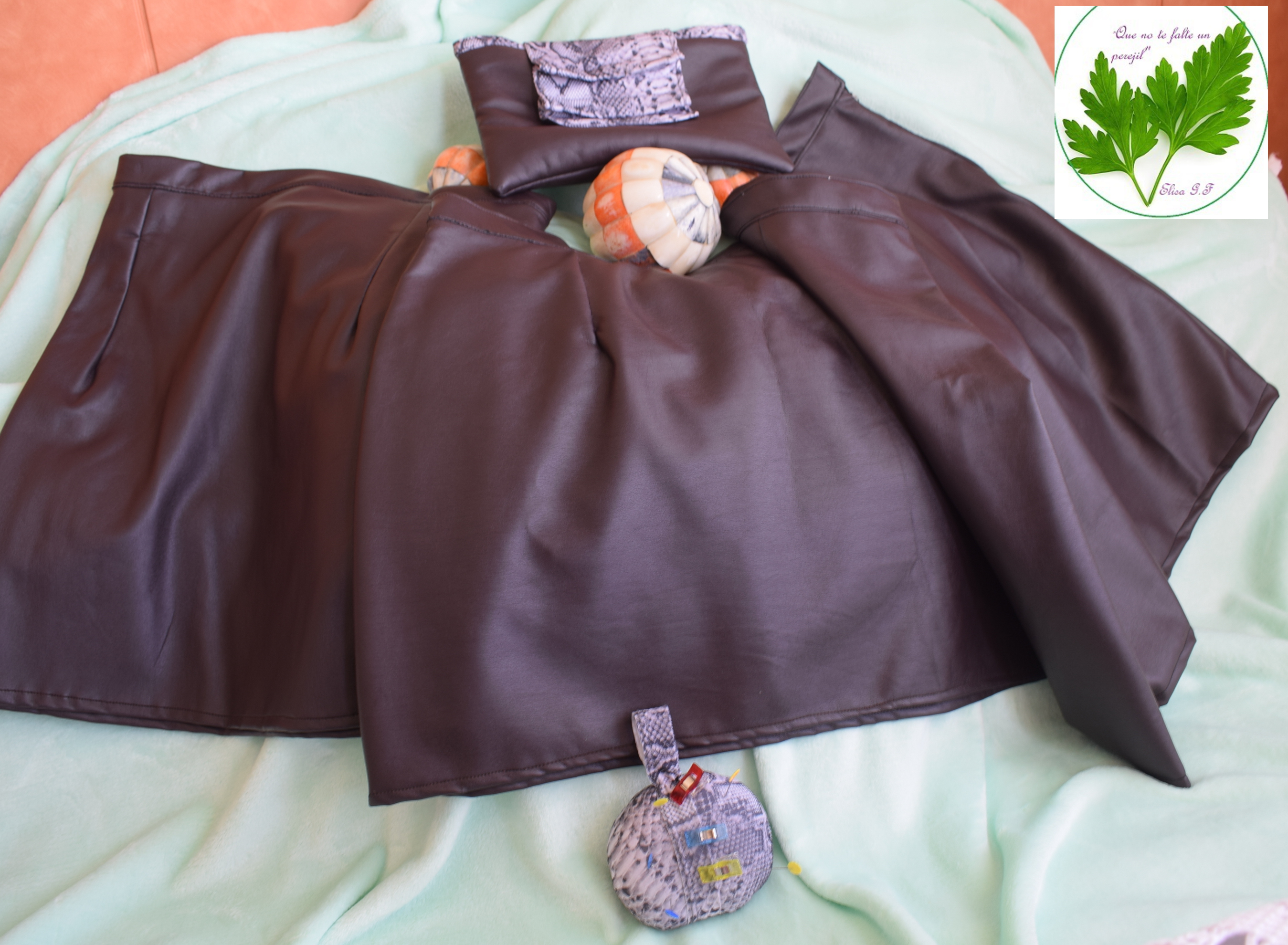 Además de enseñaros las faldas, quiero recalcar que si en la cocina no se tira nada, menos se tira en la costura, diversas labores o manualidades. Nunca tiro trocitos de telas, cordones, pasamanerías.. En algún momento pueden volver a ser utilísimas. Por ejemplo, con trocitos que sobraron de polipiel después de cortar las faldas hice la cartera. Siempre viene bien una cartera pequeña para guardar el móvil, la barrita de labios o el monedero. La combiné con otro retal de tela sobrante de acortar un vestido.