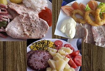 INGREDIENTES:1 lata mediana de maíz1 lata mediana de guisantes2 hamburguesas250 gr de patatas1 tomateAceite SalELABORACIÓN: