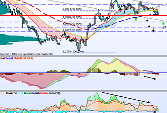 En el gráfico diario de Mafre el Koncorde muestra como la mano fuerte ya ha empezado a vender. En el histograma del MACD vemos como hay menos presión vendedora en las últimas sesiones, pero simplemente por lo que he dicho antes, la ausencia de volumen.