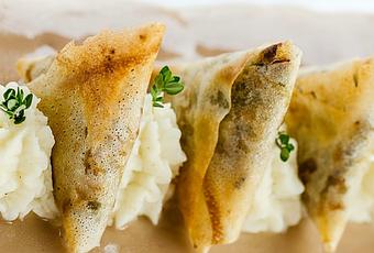 Estiramos la pasta brick y la pincelamos con mantequilla derretida, cortamos tiras de seis centímetros de ancho (aproximadamente salen 5 tiras de cada hoja) , ponemos una cucharita de la mezcla de carne y pera en la parte inferior de cada tira, dejando aproximadamente un borde de dos centímetros, doblamos la masa cogiendo por una punta y llevándola al lado opuesto pasando por encima de la mezcla, continuamos doblando en zig zag hasta formar el triángulo. Así haremos con las demás tiras. Cuando tengamos todos los triángulos formados, los colocamos en una bandeja de horno ligeramente untada en aceite. Pintamos un poco con mantequilla y los llevamos al horno precalentado a 190º entre 15 y 18 minutos.