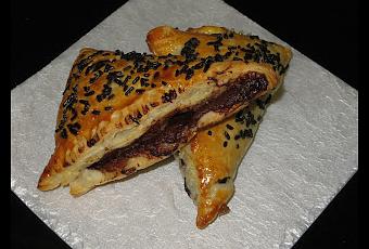La masa de hojaldre que os recomiendo es rectangular porque así se cortaría en cuatro trozos y es más sencillo realizar los triángulos. Estiramos la masa de hojaldre, la cortamos en cuatro trozos iguales y en el interior ponemos un par de cucharadas de crema de cacao o si queréis una receta un poco más elaborada derretís chocolate negro o con leche con un poco de nata al microondas y rellenáis los triángulos con esta mezcla.