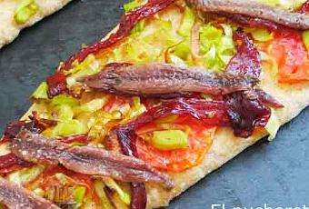 Metemos al horno precalentado a 180º durante 15-20 minutos, una vez hecha la pizza le ponemos las anchoas por encima, intentando hacerlo de forma decorativa, echamos un hilillo de aceite de oliva virgen sobre cada triángulo y dejamos apenas un minuto en el interior del horno.