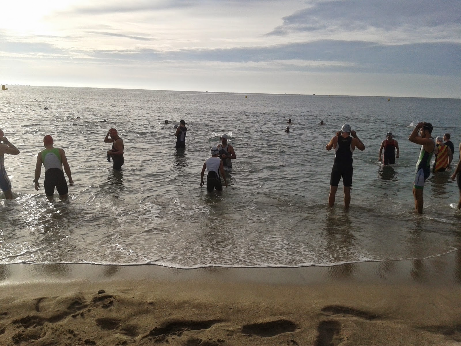 No esta muy fría , no se necesita neopreno y esta como una piscina, nos llama la organización y hacen un pequeño brefing de las dos triatlones . Mi salida va a ser a las 9h en punto, y tengo tiempo de calentar un poco tanto fuera como dentro del agua.Calentando
