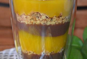 He utilizado un vaso grande. La primera capa del fondo la ponemos de bizcocho de mango desmenuzado. A continuación una capa de crema de chocolate. Encima otra capa de coulis de mango, de nuevo otra capa de chocolate, bizcocho otra de coulis de mango y finalizamos con un adorno de nueces caramelizadas.