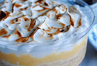 Coronamos nuestro trifle con el merengue y doramos la superficie con un soplete para darle un toque de color.
