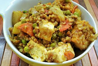Trigo sarraceno con tofu y verduras1 taza de trigo sarraceno2 tazas de agua1 bloque de tofu1 zanahoria1 taza de guisantes1/2 pimiento rojo1 cebollapatatas (opcional)2 dientes de ajozumo de 2 limonespimientasal