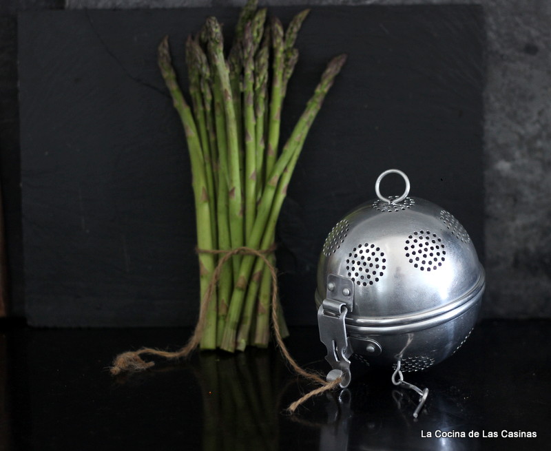 Lava los espárragos y corta los tallos. Introduce en el cacharrín o en una bolsa de tela. Incorpora en una cazuela con agua junto con los espárragos. Cuece durante 10 minutos, deben de quedar al dente. Retira los espárragos y deja un rato más los tallos ya que son mucho más duros. Pasa los espárragos por una plancha o sartén en el que has incorporado el aceite.Mientras tanto, procesa los tallos con un poco de agua de la cocción, te costará un poco formar una crema, pasa por un colador para quitar todas las fibras.Incorpora la crema a la mayonesa. Espolvorea con sal en escamas, yo tengo una de vino, tú añade la que tengas.La mayonesa coge todo el sabor de los espárragos, está riquísima. Estoy pensando que tienen que estar buenísimos gratinados en el horno. Eso será para otro día. Como ves aquí todo se aprovecha y además he conseguido darle un uso al precioso cacharrín.Gracias LolaO hoy tu cacharrín es la estrella, no me puede gustar más. Espero que a tí también te guste, bsss