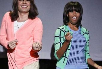 Si hay algo que nos encanta de Michelle Obama es que no teme divertirse y mostrarse como una mujer real que baila, ríe, y que lleva una vida común con sus hijas y su esposo. Recientemente, la Primera Dama estuvo en el programa “Late Night with Jimmy Fallon” y ahí habló de las habilidades del Presidente para bailar, diciendo que Barack tiene unos tres buenos movimientos y que ella lo califica con una B en ese terreno. Y para demostrar que ella sí sabe moverse, la Sra. Obama participó en un maravilloso sketch al lado del conductor del talk show, en el que mantuvieron un duelo de baile. El clip “Evolution of Mom Dancing” se hizo en honor a la campaña de salud de la Primera Dama, “Let’s Move!”, para alentar a los padres a que se pongan en movimiento junto con sus hijos. El resultado fue un despliegue de ingenio y soltura por parte de la esposa del Presidente, a quien vimos hacer sus mejores pasos y opacar a Fallon, quien apareció disfrazado de mamá. En otro sketch del mismo programa vimos a Jimmy Fallon visitar la Casa Blanca para competir contra Michelle Obama y ver quién de los dos tenía mejor condición física. La primera dama hizo push ups, movió el hula hula, jugó dodgeball e incluso jugó una carrera de costales. ¿Quién se imaginan que ganó? Vean el video aquí. Esta original manera de promover el tercer aniversario de la iniciativa “Let’s Move!” inició el viernes pasado en New York con la visita de Michelle Obama a NBC para grabar el programa de Jimmy Fallon así como un episodio de “The Dr. Oz Show”, que será televisado el próximo 28 de febrero. La Primera Dama también estuvo en “Good Morning America” de ABC.