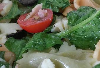 Incorporamos también los taquitos de queso, las espinacas (bien lavadas y cortadas), las aceitunas cortadas en rodajitas y los tomatitos cherry partidos por la mitad.