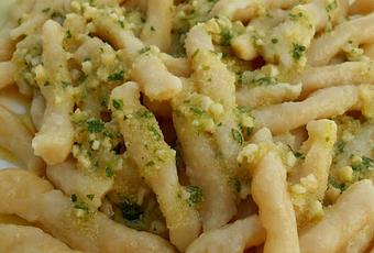 Dividimos la masa en trozos pequeños y formamos rollos de 2 cm. de grosor. Cortamos trocitos de 1,5 cm de ancho, frotamos cada uno entre las manos para estirarlos y los retorcemos para darles su froma característica. Yo hice un tercio de masa de esta manera y al resto le di forma de ñoqui.