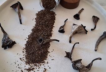 Este año las lluvias de estos meses atrás, nos dio sus frutos y pudimos disfrutar de coger algunas setas.Cosa que hace unos años que no lo hacíamos por la falta de lluvia.El caso es que hemos cogido unos tres cestos de trompetas de la muerte y como siempre he deshidratado de forma natural al sol, después las guardo en botes de cristal o bolsas herméticas.También una parte de ellas las hago en polvo, es perfecto para añadir en salsas, les da un sabor espectacular!!Os explico como lo hago.La próxima receta llevara este ingrediente, no te la pierdas.Ingredientes:Trompetas de la muerte