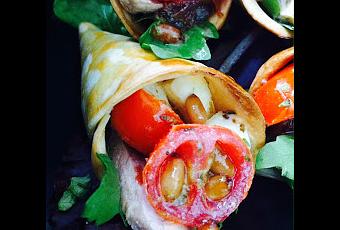 - Introduce dentro de cada trompeta unas hojas de rúcula, una lasca de ventresca y completa con los tomates, los piñones y el queso.