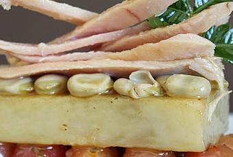 Ingredientes: (Para dos personas.)Para la patata confitada: 200 gr Patata pelada. Aceite de oliva. Sal y pimientas negra en grano. Para el resto de la ensalada: 60 gr Tomate cherry. 40 gr Habitas tiernas en conserva. 85 gr Ventresca de atún en conservas. 10 gr Tomate concentrado. Sal y pimienta negra. Aceite de oliva. Procedimiento: En primer lugar,cortamos la patata en forma rectangular ,de un centímetro de grosor como se ve en la foto,la colocamos en una olla pequeña,la cubrimos con aceite de oliva,unos granos de pimienta negra,y la dejamos confitar a fuego muy bajo,durante 1 hora,la dejamos enfriar el el aceite,y reservamos. Salteamos los tomate cherry en una satén con aceite y un poco de sal,a continuación le quitamos la piel y los reservamos . Montaje: Cojemos un pincel,y lo mojamos en tomate concentrado,pintamos una franja en el centro de plato,como se ve en la imagen,colocamos encima los tomates cherry,a continuación la patata,las habitas,y por último la ventresca,y decoramos con los granos de pimienta negra.