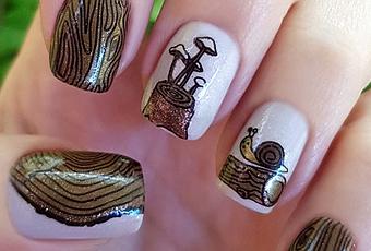 Como base he estrenado este esmalte de El Corazón con partículas de brilli, que me parece ideal así para bases de manicuras decoradas. Lo apliqué en las uñas del pulgar, corazón y anular. Sobre estas uñas coloqué reverses de varias imágenes de la placa todas relacionadas con troncos de árbol: un "corte" de tronco en la uña del pulgar, un tronquito con setas (son dos imágenes distintas) en el corazón y un tronquito con un caracol (también son dos imágenes distintas en la placa) en la uña del anular.