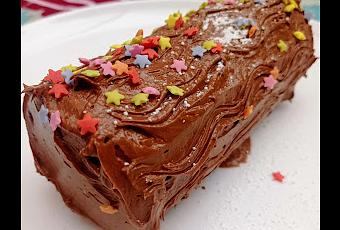 Es un tronco hecho con galletas maria y relleno de crema de chocolate.