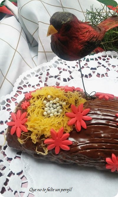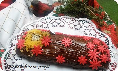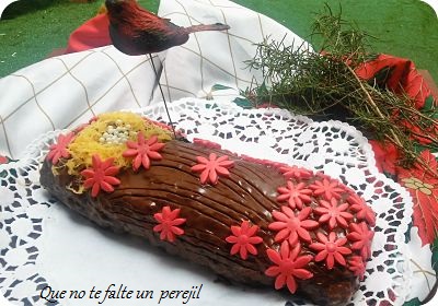 Desenrolla el bizcocho y pon en el la crema pastelera ya fría , sin llegar a todos los bordes para que al enrollar no se salga. Cubre con el ganaché de chocolate, llévalo al frigorífico para que coja más cuerpo y entonces saca , haz unas rayas con un tenedor para simular la corteza del árbol y adorna como más te guste.