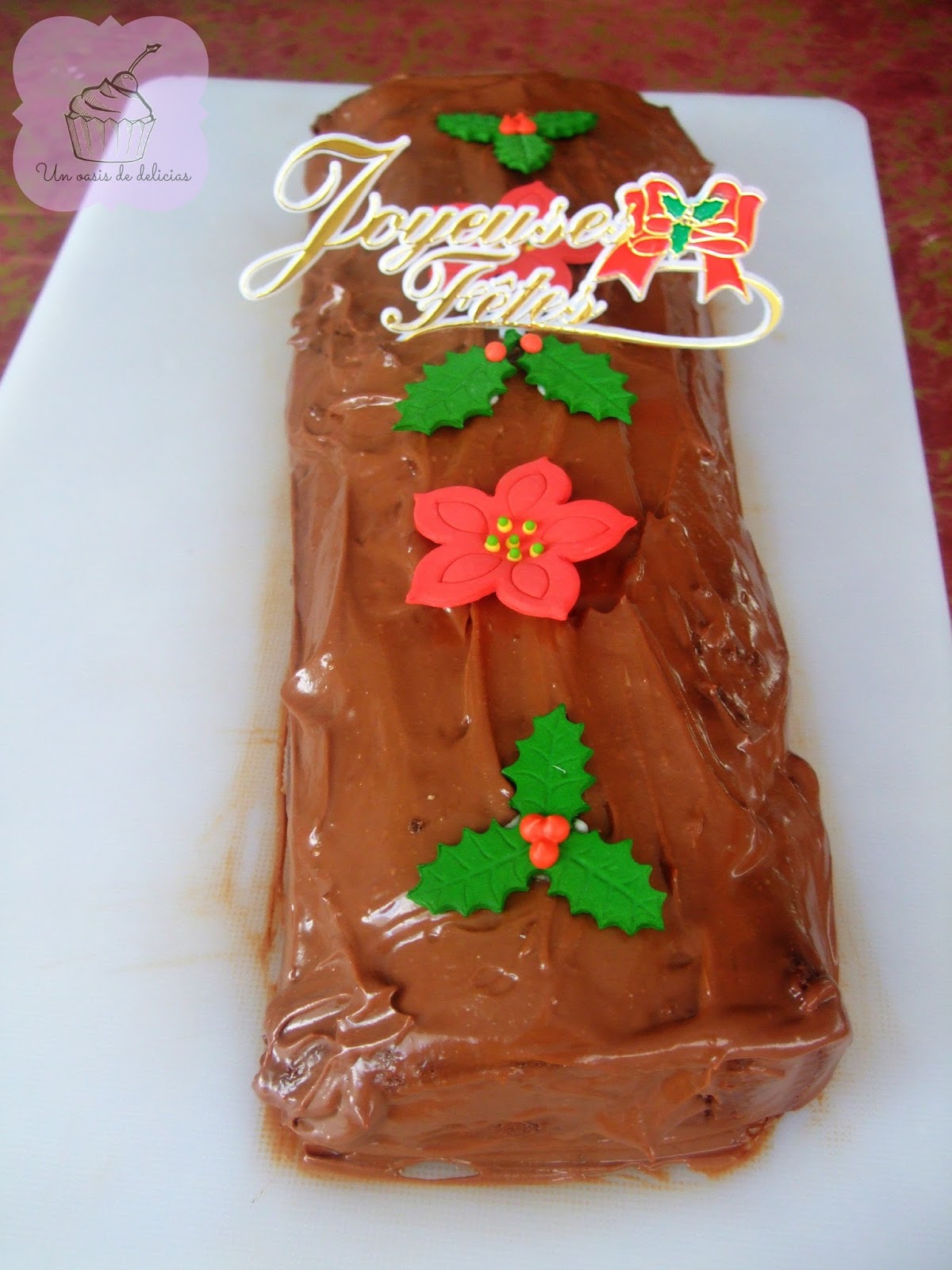 Sólo falta la parte más difícil, el enrollado.1° Distribuimos la crema pastelera de coco en el bizcocho.2° La repartimos con una espátula.3° Enrollamos el bizcocho. No es una tarea fácil, y los más impacientes querrán rendirse cuanto antes. Lo enrollamos con la ayuda del tapete-molde de silicona. Enrollamos uno de los lados más cortos. El bizcocho debería despegarse del molde y a partir de ahí, podremos seguir enrollándolo. Si no tenemos tapete-molde de silicona, desmoldamos el bizcocho y lo enrollamos con la ayuda de una trapo de cocina.4° Colocamos el bizcocho en la bandeja en la que lo vamos a servir y lo cubrimos con crema de chocolate.5° Decoramos el tronco como queramos.6° Lo guardamos en la nevera hasta la cena de Nochebuena o de Nochevieja (preparamos el tronco de navidad el mismo día por la mañana).