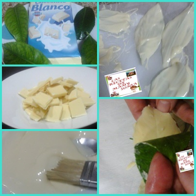 A continuación derretimos el chocolate blanco y pintamos unas hojas