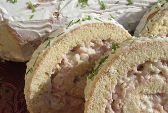 5- Extender el relleno por todo el bizcocho, enrollar, cubrir con una fina capa de queso de untar y adornar a gustos.