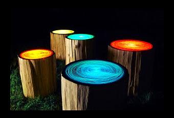 Hoy os enseño uno de los diseños de Judson Beaumont "Tree Rings". Creados para participar en el programa de Luz de Salt Spring Island. Fabricados vaciando madera de pino y colocando una tapa de resina tintada de colores,con luz interior.