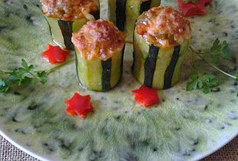 Lavar los calabacines, cortar las puntas y partirlos en tres tronquitos del mismo tamaño cada uno. Ponerlos en una olla con agua ligeramente salada, una vez que empiece a hervir, cocer a fuego lento durante 10 minutos, escurrir y dejar enfriar. Extraer y picar la pulpa.