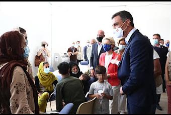 Pedro Sánchez, Ursula von der Leyen y Michel Barnier conversan con refugiadas afganas en la base de Torrejón.El presidente del Gobierno, Pedro Sánchez, junto con la presidenta de la Comisión Europea, Ursula Von der Leyen, el presidente del Consejo Europeo, Charles Michel, y el jefe del Servicio Europeo de Acción Exterior, Josep Borrell, visitaron el pasado día 21 el campamento levantado en la base de Torrejón de Ardoz (Madrid). Sánchez convocaba así una cumbre europea y rompía siete días de silencio sobre la crisis en Afganistán. En esta ocasión sí habló largo y tendido de España y aseguró que “España está a las duras y a las maduras”. “Esto es –declaró– una tragedia humana. El Gobierno ha estado pendiente de esta crisis desde el primer segundo”. Recordó que Afganistán no es un lugar ajeno a España ya que, con el trabajo en la provincia de Bagdhis, “hemos permanecido veinte años en el país y hemos logrado mantener una cierta paz y estabilidad”. Y agradeció el trabajo de la policía nacional y de los diplomáticos que estaban todavía en Kabul. Por su parte, el presidente de la Comisión, Charles Michel, aseguró que fue el propio Sánchez quien ofreció que Torrejón se convirtiera en el centro de reubicación para los afganos que trabajaron para el Servicio europeo de Acción Exterior. Igualmente, Von der Leyen agradeció la labor de España, “ejemplo de lo que es el alma de Europa” y puso el foco en la ayuda humanitaria que la UE iba a ofrecer. La presidenta de la Comisión Europea aseguró, además, que la ayuda a Afganistán por parte de la UE iba a continuar. El ministro de Exteriores, José Manuel Albares, indicó que España tiene “su cuota de solidaridad” y que aquí se quedarán “unos 50” afganos con estatus de refugiado que es lo que a un país de este tamaño “le corresponde”. Desde la semana pasada, los principales líderes europeos, como Ángela Merkel, Emmanuele Macron o Boris Johnson, comparecieron públicamente y convocaron una reunión de urgencia con sus Ejecutivos. Por su parte, Sánchez se limitó a dar constancia del plan de evacuación de los españoles y colaboradores afganos con las tropas españolas y la Embajada española en Kabul a través de su cuenta de Twitter.