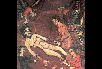 Así lo ejecutaron los verdugos: sin prisa le cortaron los dedos, falange a falange, luego los dedos de los pies, las manos, las piernas y brazos. Sin prisa. Cuando solo era un tronco con cabeza, le cortaron las orejas y la nariz. Finalmente, le aserraron el tronco por el medio, a la par que el santo decía: - "luego que las ramas se han cortado, es hora de cortar el tronco para siempre". Y murió entonando salmos y cánticos a Dios. Los cristianos recogieron los 28 trozos en los que quedó dividido el santo cuerpo y los sepultaron piadosamente, mientras invocaban la intercesión del santo mártir.