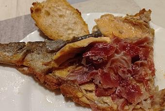 Ingredientes:Una trucha de unos 250 g aprox. por personaLonchas de jamón serrano3 dientes de ajosHarinaAceite de olivaPimienta molidaSalElaboración;Salpimentar las truchas, sin pasarse con la sal, que lleva el jamón.Rellenar su interior con las lonchas de jamón.Cerrarlas y enharinarlas.