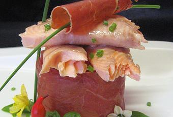 3º " Le quitamos la piel a la trucha y le quitamos la piel, sale fácilmente. Después y con la ayuda de un cuchillo partimos uno de los lomos en cuatro trozos y emplatamos tal y como se ve en la foto.