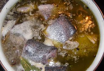 Elaboración: Lo primero que hacemos es el escabeche, para ello echamos en una olla, las dos cabezas de ajo peladas, las diez hojas de laurel, los dos puñados de pimienta y por cada vaso de aceite añadimos otro de agua y dos de vinagre. Se pone a cocer y cuando rompe se añade la trucha salada.