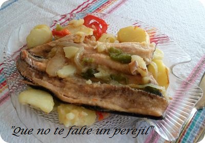 Con cuidado de no romper las truchas, saca las patatas y pimientos una bandeja de servir o plato y encima coloca las truchas. Sirve de momento para que no se enfríen.