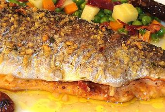 IngredientesTruchas asalmonadasTomates secos macerados en aceite de oliva, con sal, ajo, y perejilRomeroTomilloOréganoPan rallado gruesoSal de cocinaFlor de sal ahumada5 o 6 cucharadas de vino blanco traminer aromático (vino joven con sabor a uva verde)
