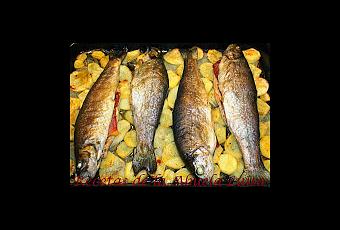 - Untamos la bandeja del horno con un poco de aceite. - Limpiamos y cortamos la cebolla en rodajas finas, con ellas cubrimos el fondo de la bandeja, sobre ellas disponemos las patatas cortadas en rodajas más bien finas. - Sobre la cebolla y las patatas espolvoreamos un poco de sal, pimienta y pimentón al gusto, ponemos también un chorrito de aceite. - Limpiamos las truchas (si ya lo han hecho en la pescadería no hace falta), rellenamos cada una con una loncha de jamón y las colocamos sobre la cama de patatas y cebolla, sobre ellas rociamos el vino blanco y un chorrito de aceite. - Metemos en el horno precalentado a 180º durante unos 30 minutos, las patatas han de quedar tiernas y el pescado ligeramente dorado.
