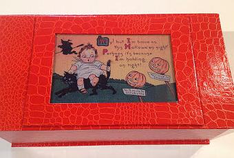 Se acerca Halloween y hay que hacer acopio de caramelos. Caja Truco o trato, realizada en simil piel y lámina de Halloween vintage