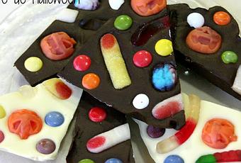 Como veréis no tiene ninguna complicación. Sólo se trata de fundir chocolate con cuidado de que no se queme. Una vez fundido, repartir sobre un papel de hornear (da igual que no quede con una forma cuadriculada o redondeada). Repartir por encima las chuches, lacasitos, conguitos, ... Y dejáis enfriar. Una vez frío veréis que se despega fácilmente del papel y cortais las porciones como más o guste. Y ya solo queda esperar para repartir o comer.
