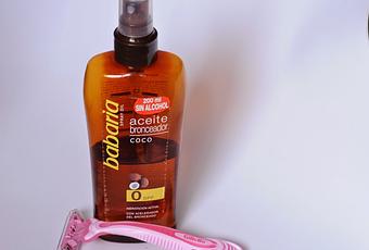 Ahora estoy usando el aceite bronceador de Babaria con olor a coco,pero cualquiera sirve,pulverizo la zona y a continuación empiezo a depilar.