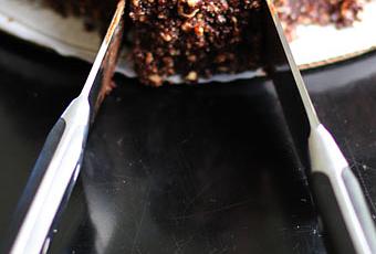 Si, si estáis leyendo bien. Consiste colocar las puntas de los cuchillos juntas en el centro de nuestra tarta abriendo los cuchillos formando el tamaño de porción que deseemos y el resto es tan sencillo como presionar y cortar la primera porción.