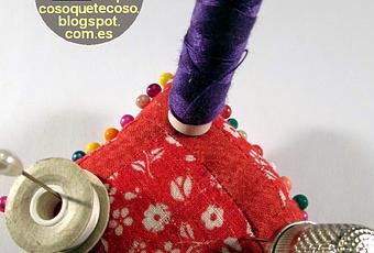 A ver que tontería se le ha ocurrido hoy a la de CosoQueTeCoso.Un acerico, un dedal, una canilla y una bobina de hilo.Os lo explico enseguida.Cuando estamos cosiendo siempre se nos despista el dedal, no podemos meterlo en el costurero porque sería lo mismo que buscar las llaves en el bolso, misión casi imposible de conseguir, pero si nos acostumbramos a dejarlo suspendido sobre un boni, os prometo que funciona. Al principio cuesta acostumbrarse a "colgarle", pero una vez te habitúas, te parece como un juego dejarle ahí.Después, el hilo que estamos usando, ése se esconde en cualquier pliegue de nuestra ropa, y no os digo nada si es el invisible que viene en canilla.Pues lo mismo, con el acerico bien a mano, ponemos los hilos y no hace ni falta sacarlos para servirnos del hilo, tiramos y "voilá" ya tenemos nuestra hebra dispuesta.Me encantaría que os fuera útil y, si os apetece, compartir dónde tenéis a mano estos objetos imprescindibles.Y sigo coso que te coso...