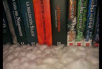 Sí, eso que veis es nieve. Para ello, es bueno poner un papel en la parte que no hay libros de la estantería. Encima de ese papel se pegan trozos de algodón y ya está. La verdad es que queda muy original y me parece una buena idea.