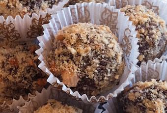 Con el calor de las manos, el chocolate se habrá derretido ligeramente y se adherirá mejor la cobertura. Pasamos las bolas por el plato con el rebozado (que puede ser simplemente cacao en polvo), las dejamos a un lado y un poco después volvemos a repetir la operación para que todo el exterior quede bien cubierto.
